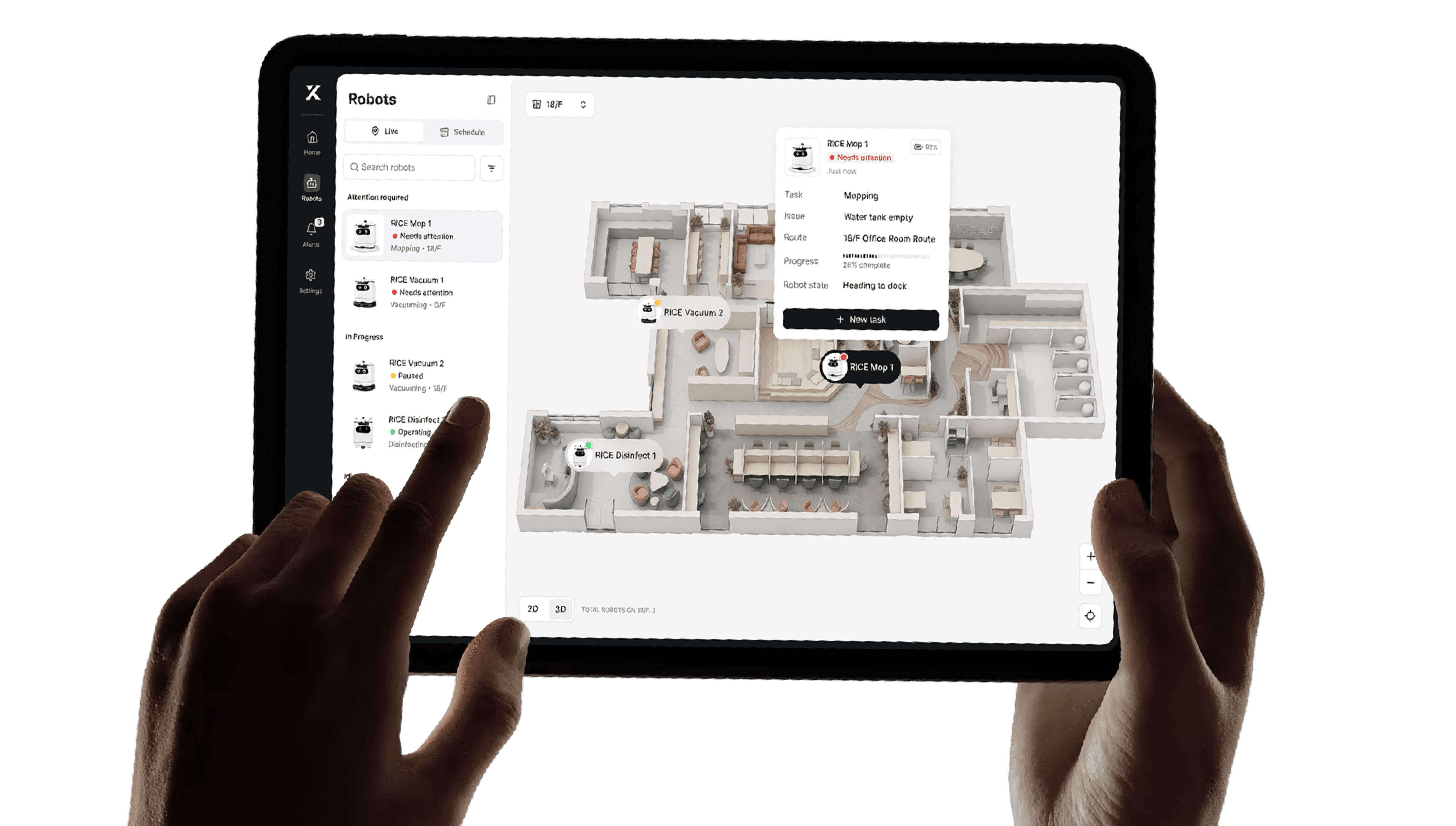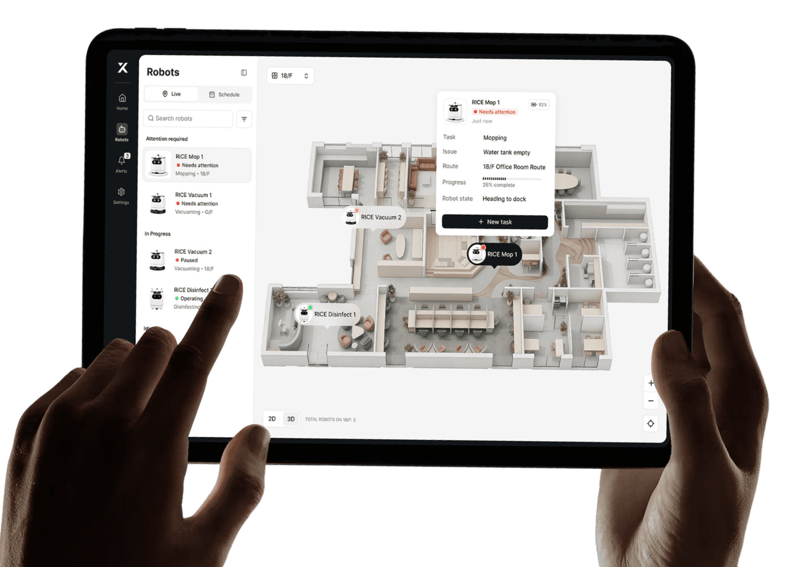 Powered by Xero and Optimus platforms, our intelligence layer enables real-time fleet visibility, remote robot control, IoT data integration, video AI analytics, and automated reporting across distributed environments.